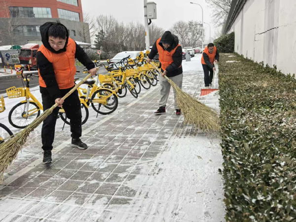 本次清扫范围主要为电子科技园居民楼北门至白浮泉公园入口路段的人行步道。扫雪现场,党员同志带头行动,大家手持扫帚、铁锹、雪铲等工具,不畏严寒、热情投入。寒风虽凛冽,但全员干劲十足,铁锹与地面的摩擦声、扫帚的沙沙声与彼此鼓励的谈笑声此起彼伏,共同勾勒出一幅冬日劳动暖景。经过共同努力,该段人行步道的积雪被彻底清理,通行条件得到显著改善。
